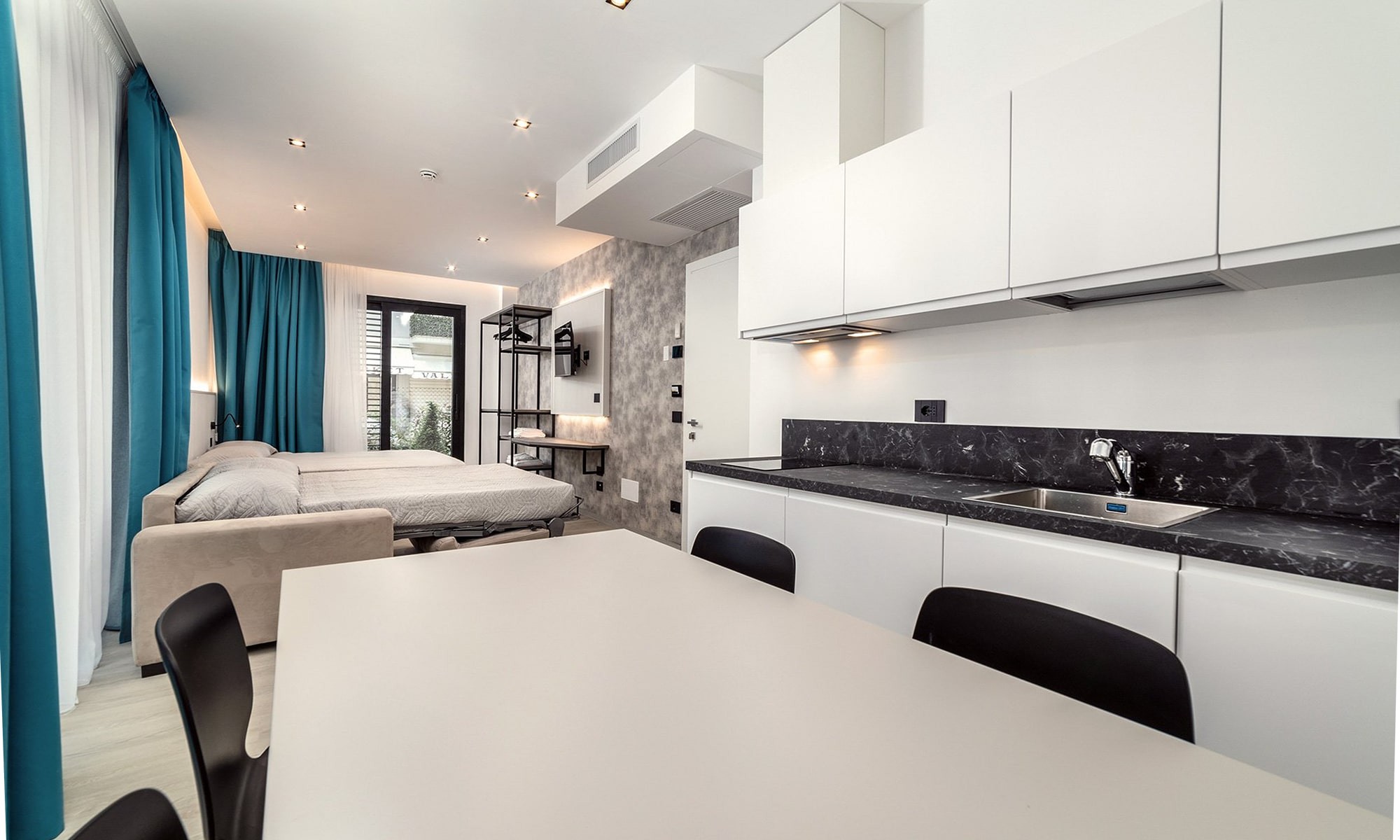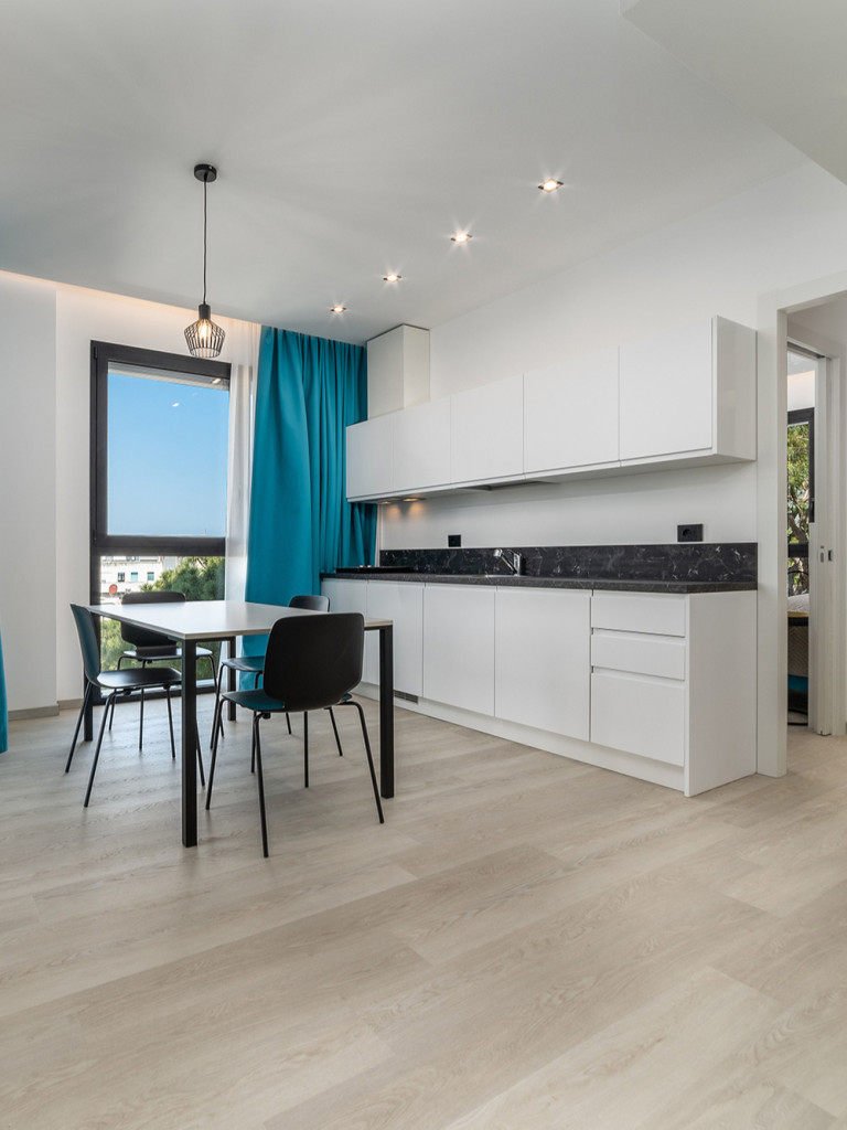 All’interno della Cala Vela Tower sono disponibili monolocali, bilocali e due attici di prestigio, tutti caratterizzati da ampie vetrate, arredi eleganti, elementi di design e comfort moderni. Soluzioni pensate per un soggiorno indipendente.
