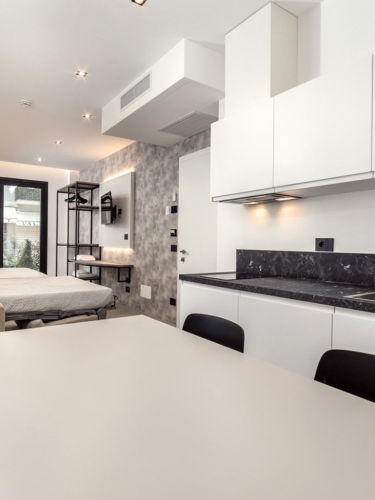 Un raffinato bilocale di circa 38mq, composto da 2 ambienti così distinti: uno con zona giorno e divano letto matrimoniale, l'altro con letto matrimoniale.
